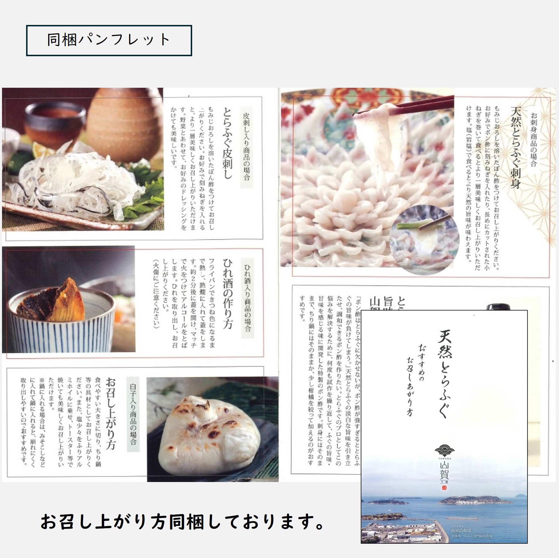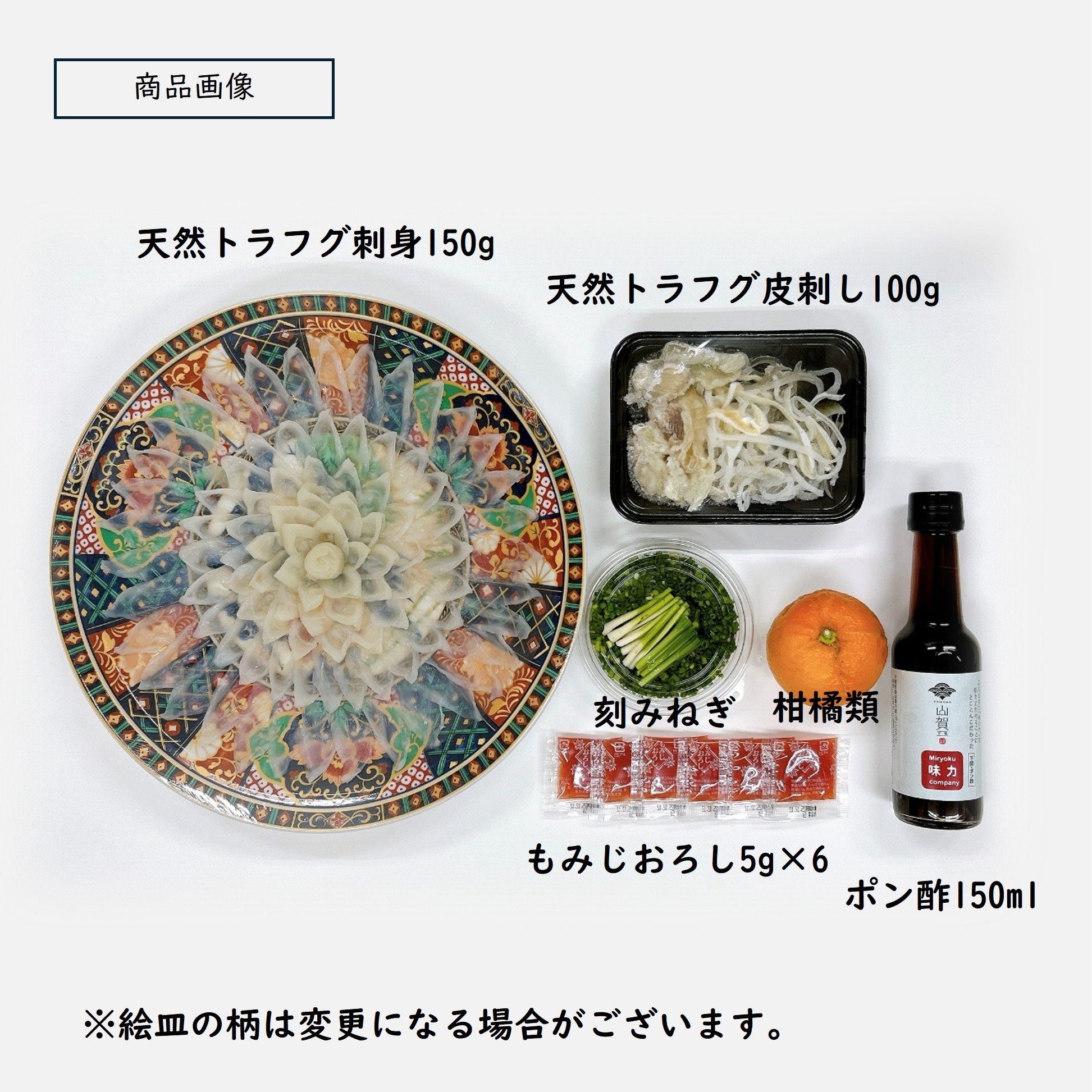 【トラフグ刺身】トラフグ(山口県産 他)【トラフグ皮刺し】トラフグ(国産)【ポン酢】醤油(国内製造)、砂糖、醸造酢、ゆず果汁、日向夏みかん果汁、昆布エキス、かつお節エキス、酵母エキス/調味料(アミノ酸等)、甘味料(甘草)、(一部に大豆・小麦を含む)【もみじおろし】大根(国産)、唐辛子/アルコール、酸味料、モナスカス色素、増粘剤(グァーガム)、香辛料抽出物【刻みねぎ】ねぎ(国産)【柑橘類】かぼす(国産)またはだいだい(国産)