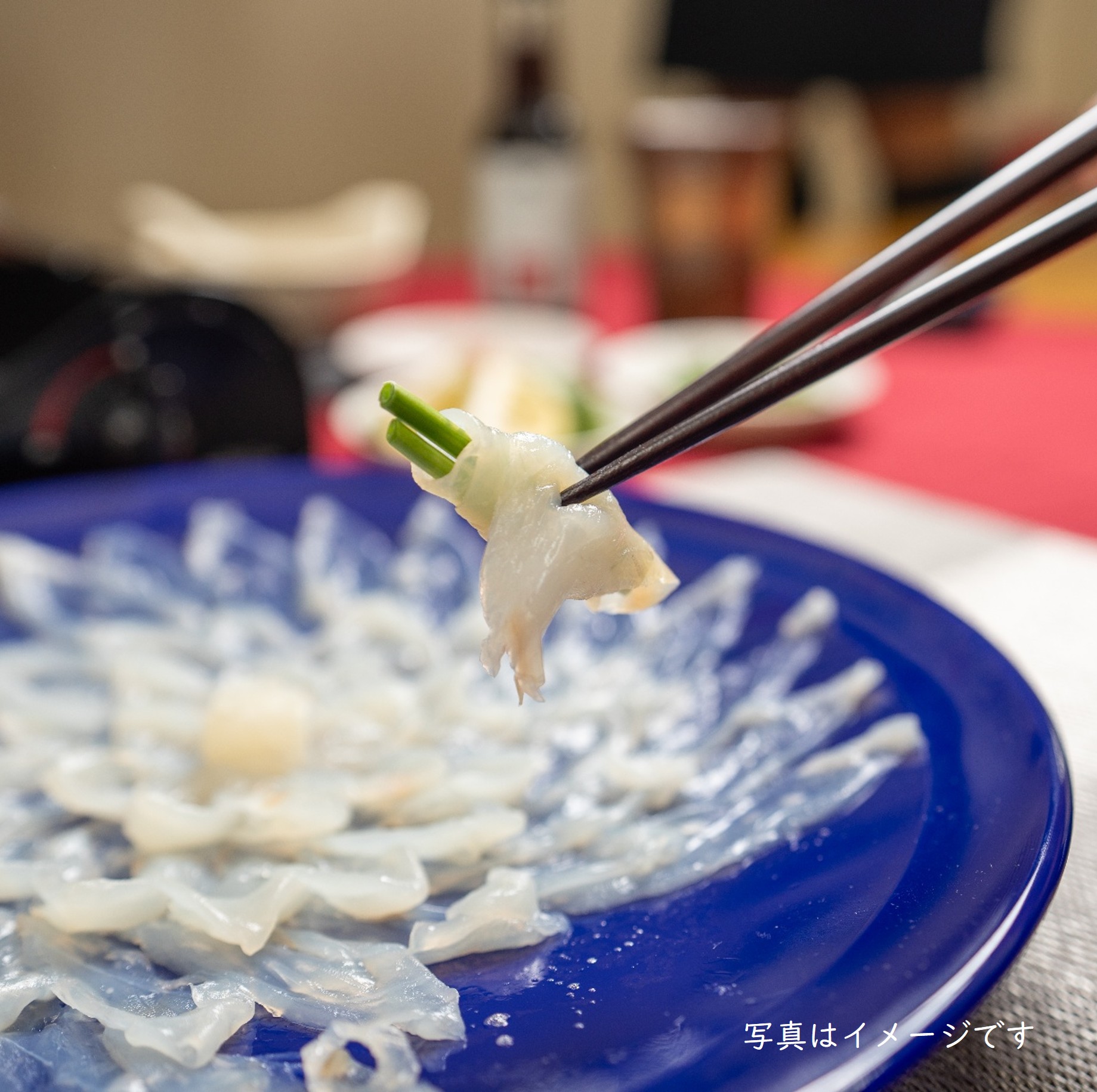 更にフグ刺しは職人が味利きをして納得した品質のものだけを、薄く引き、 美しい陶器の絵皿に盛りました。