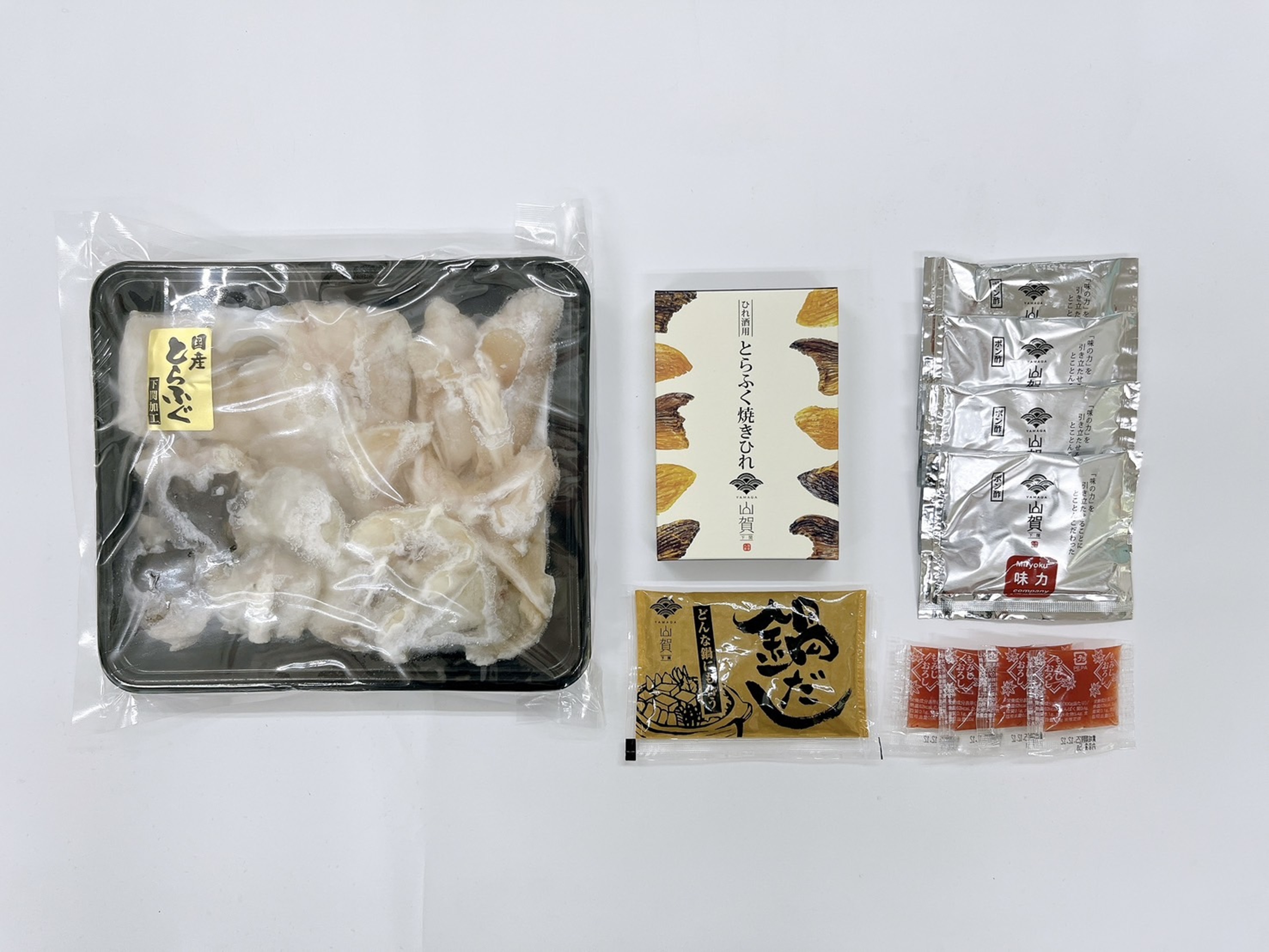 養殖トラフグちり、トラフグ焼きヒレと薬味がセットになった贅沢な一品。