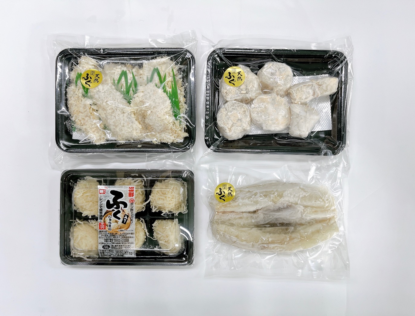 ふぐ唐揚げ、ふぐカツ、ふぐ一汐、ふぐ入りしゅうまいと様々な料理を一つの箱に詰めました。