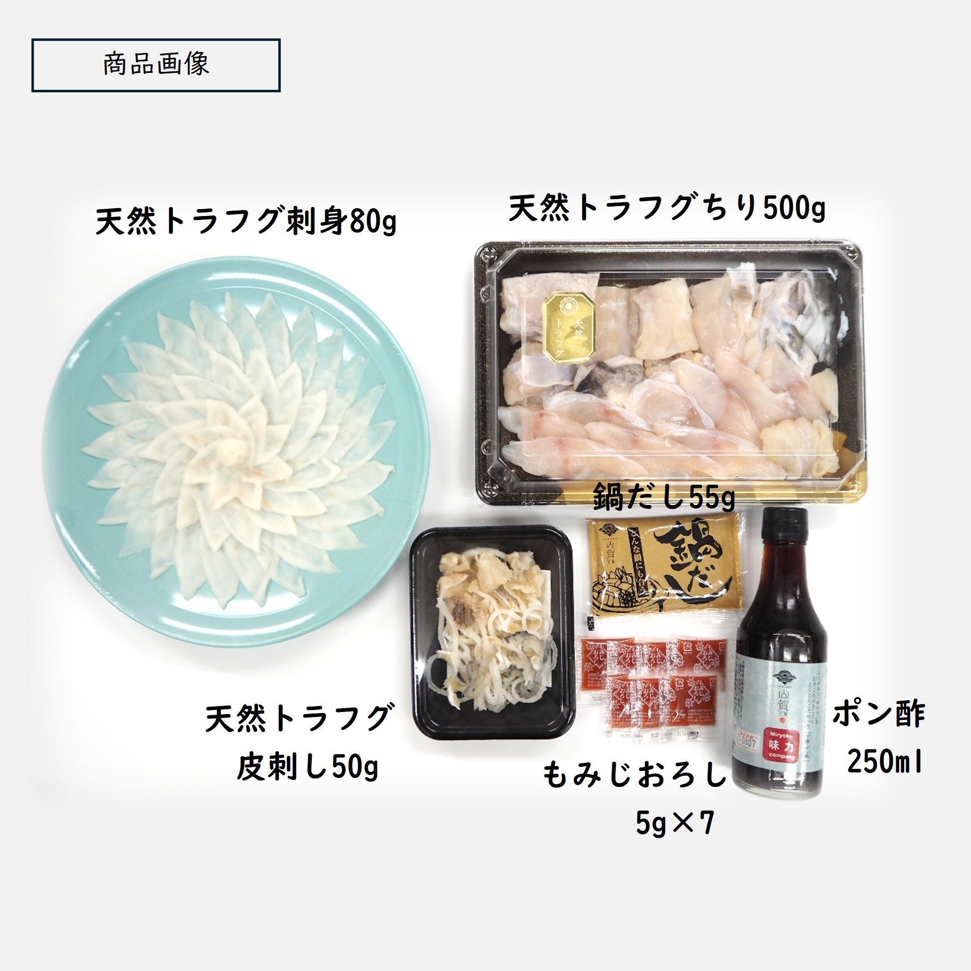 山賀の職人の目利きで選んだ2kgから3kgサイズの国産天然トラフグに、弊社社長が自ら包丁を入れ、身質の確認をした厳選素材だけを刺身・ちり鍋のセットにしました。