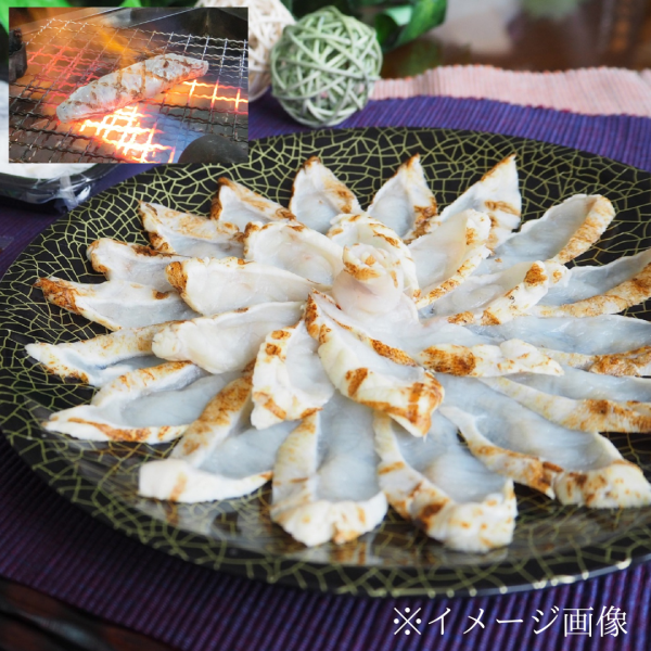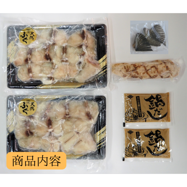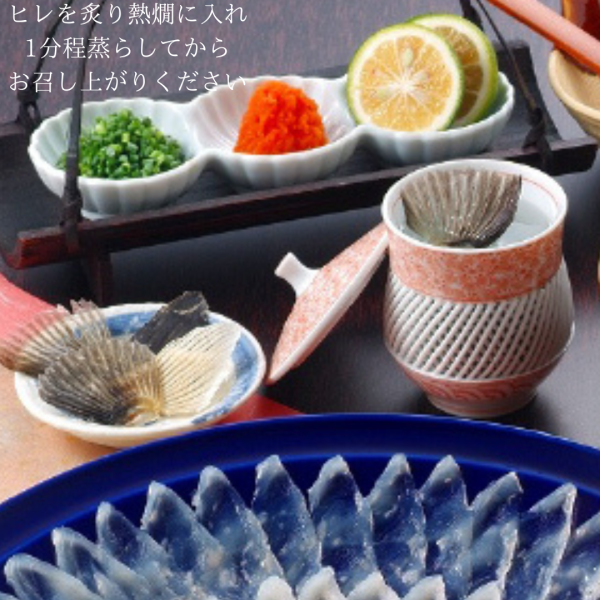 マフグ切身、マフグ炙り、とらふぐ焼きヒレ、鍋だしがセットになった贅沢な一品。