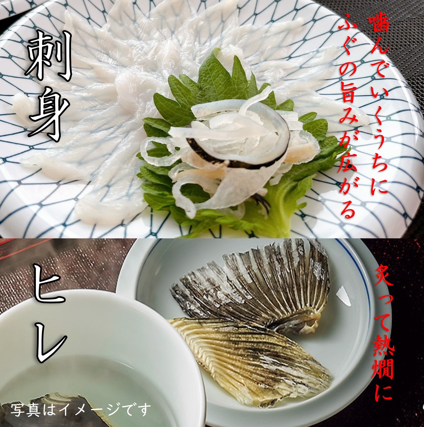 フグ刺し、ふぐ鍋、ふぐ唐揚げ、ふぐ一汐、ひれ酒が味わえるお得なセットです。