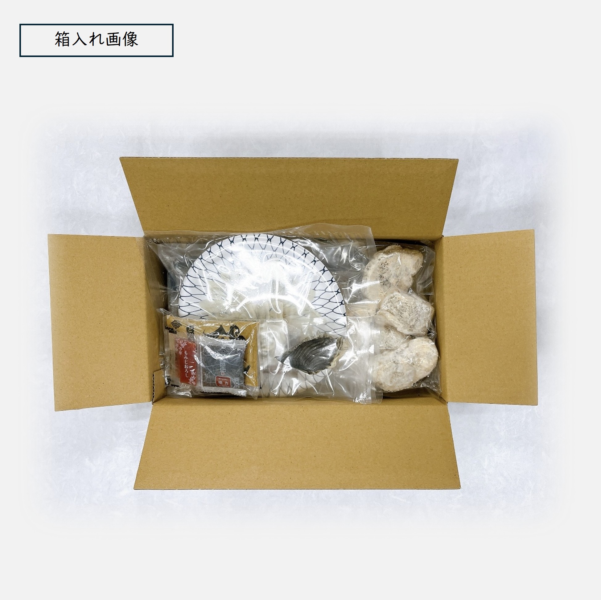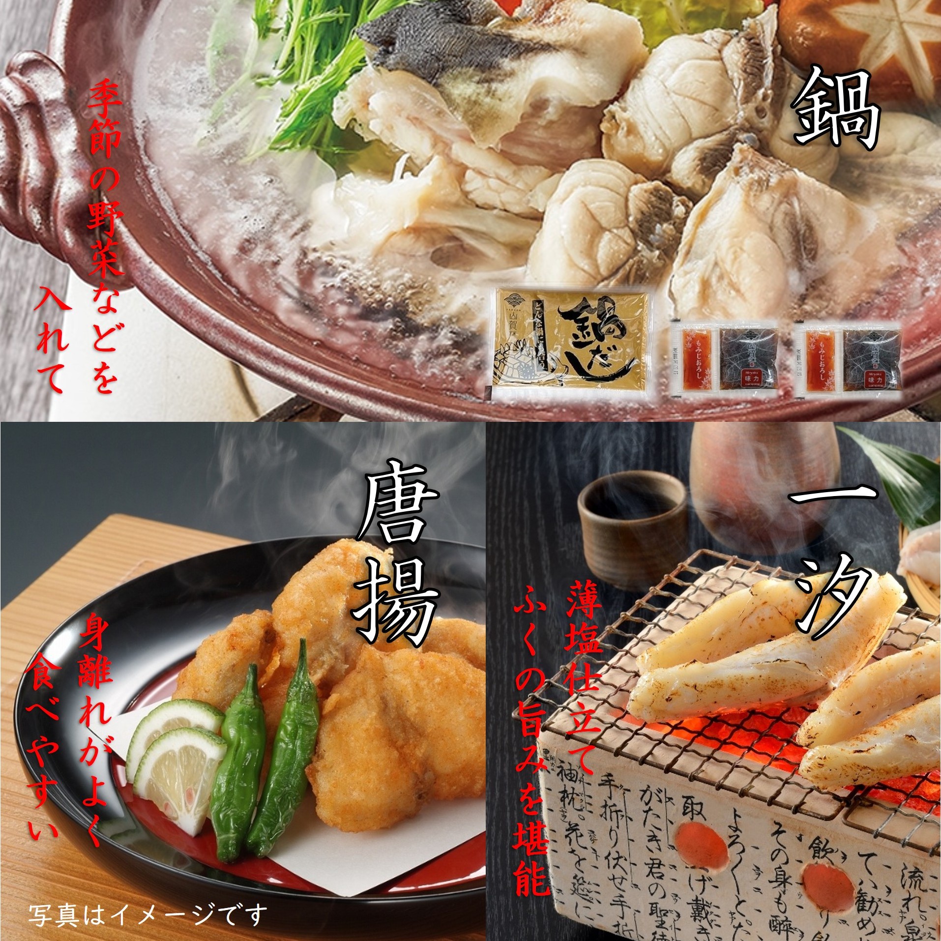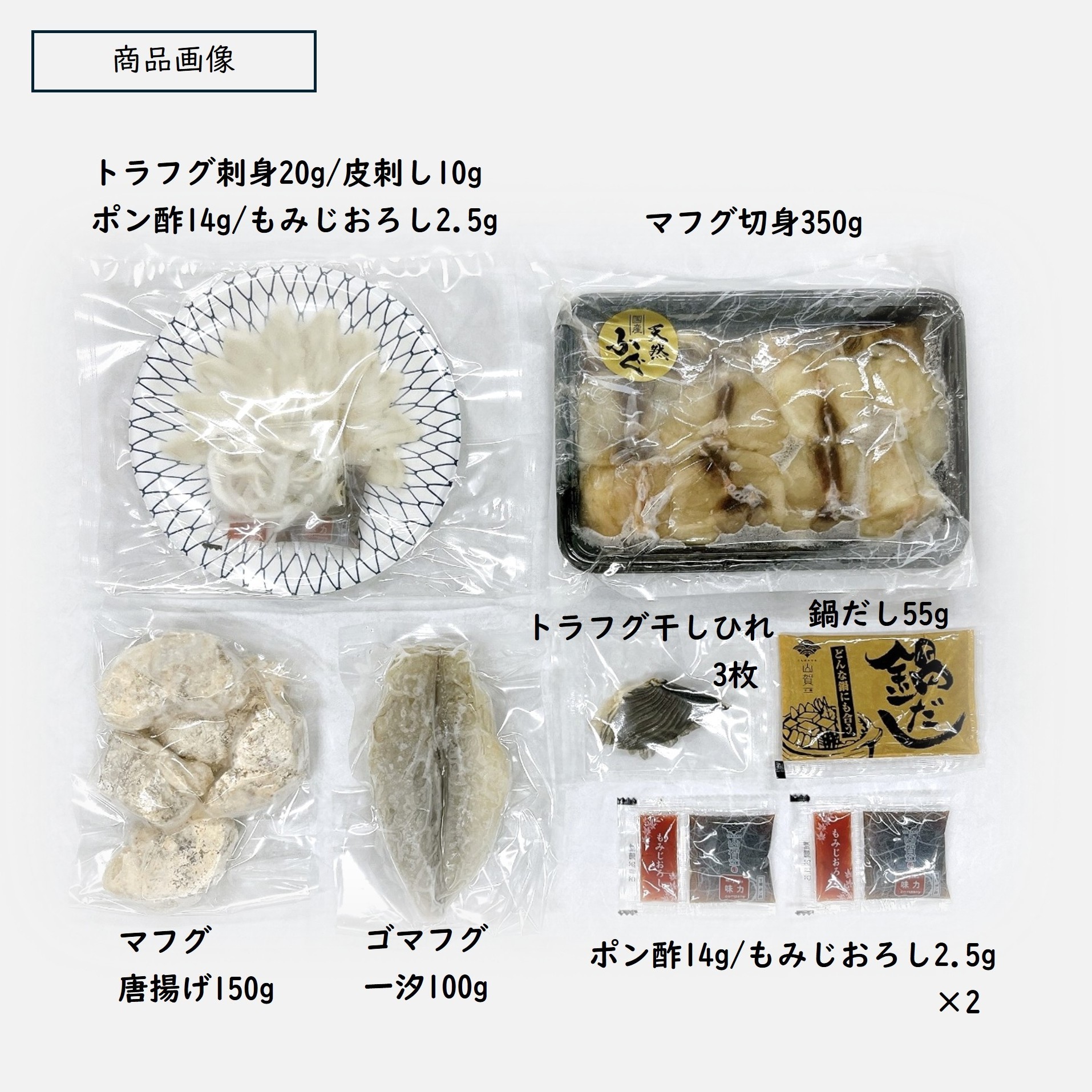 トラフグ刺身20g、トラフグ皮刺し10g、マフグ切身350g(ちり250g、アラ100g)、マフグ唐揚げ150g、ゴマフグ一汐100g、トラフグ干しひれ3枚、鍋だし55g、ポン酢42g(14g×3個)、もみじおろし7.5g(2.5g×3個)